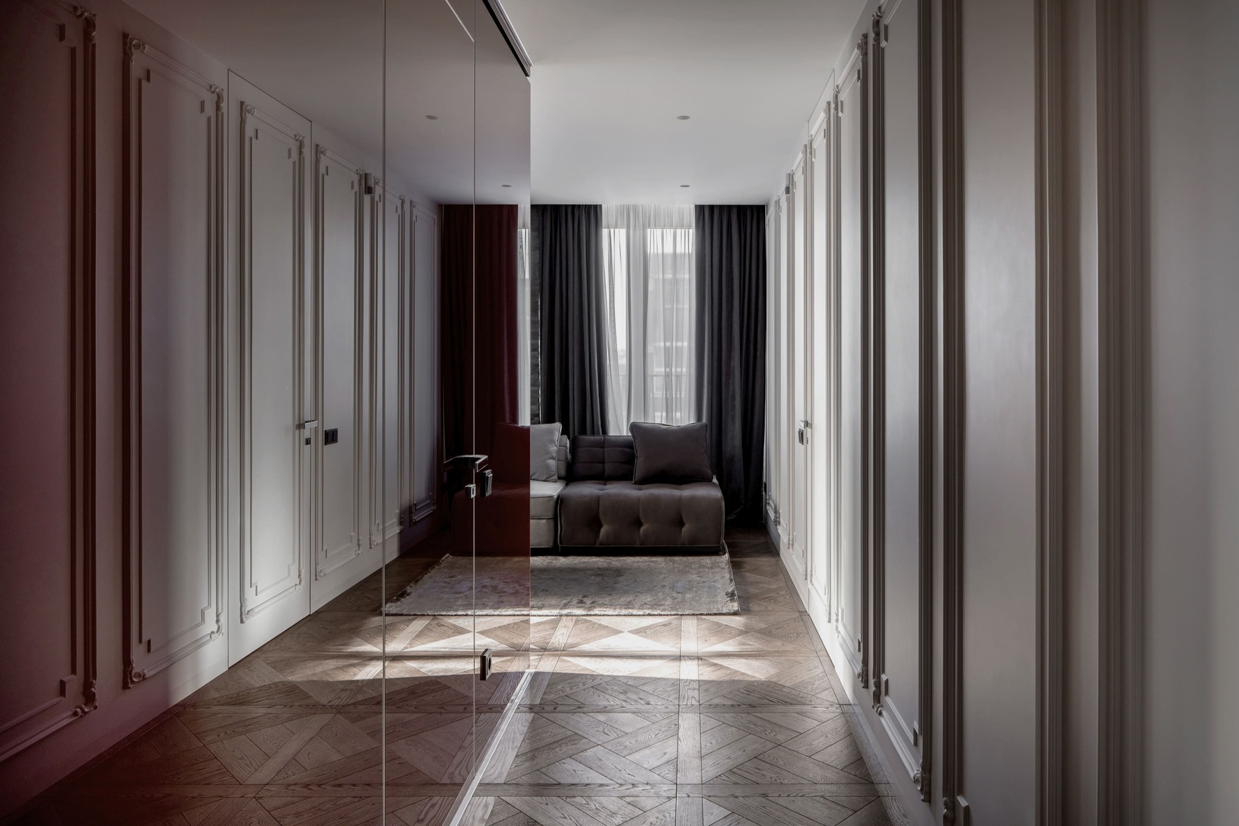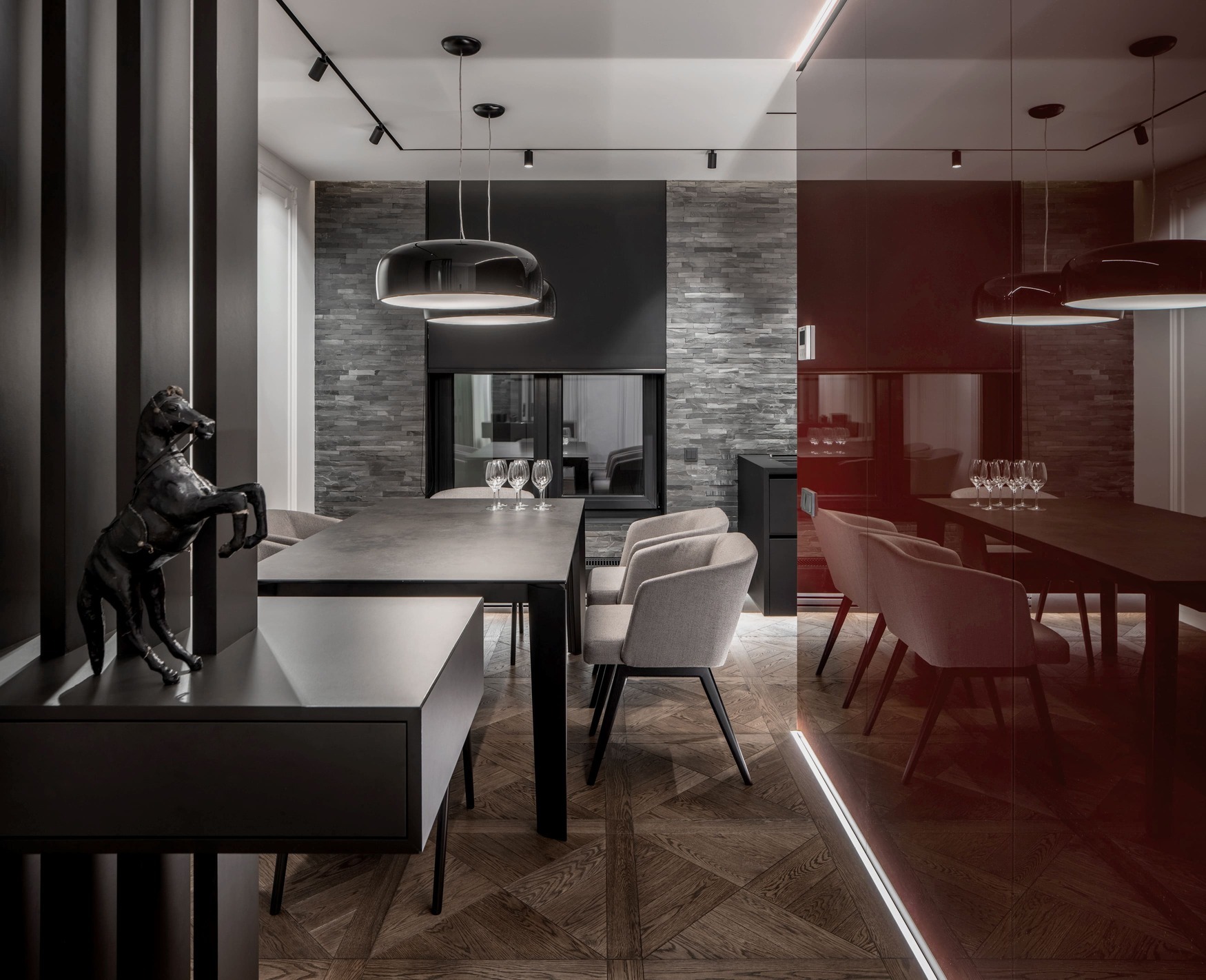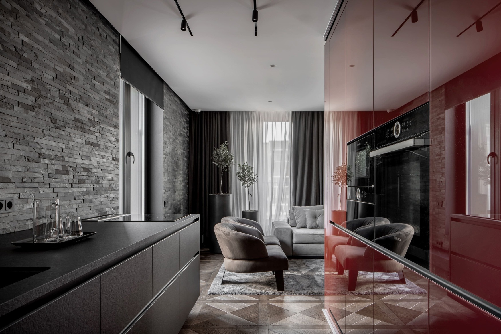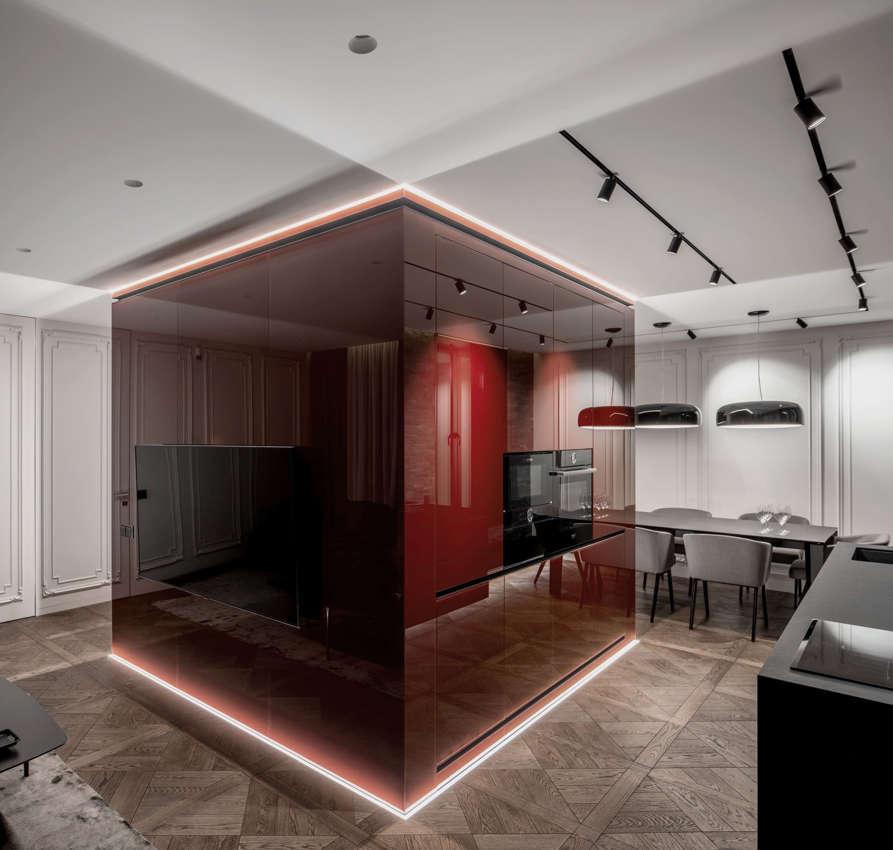 Burgundy Cube is a refined apartment project centered around a unique zoning challenge — how to divide a living and dining area structured around a central load-bearing column without sacrificing openness. The solution? A striking lacquered glass cube that brings both clarity and character to the space.