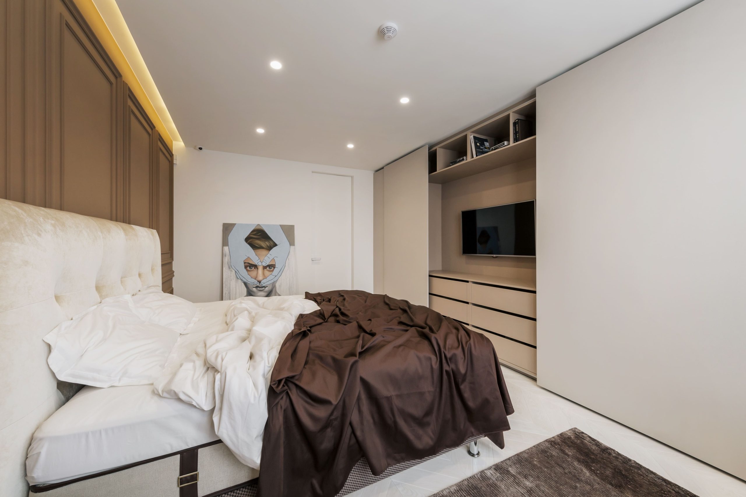 Ecstatic is a large-scale family apartment designed for comfort, light, and architectural balance. The client requested a layout with a spacious living area and a master bedroom visually linked to a bathroom and wardrobe through thoughtful partitioning.